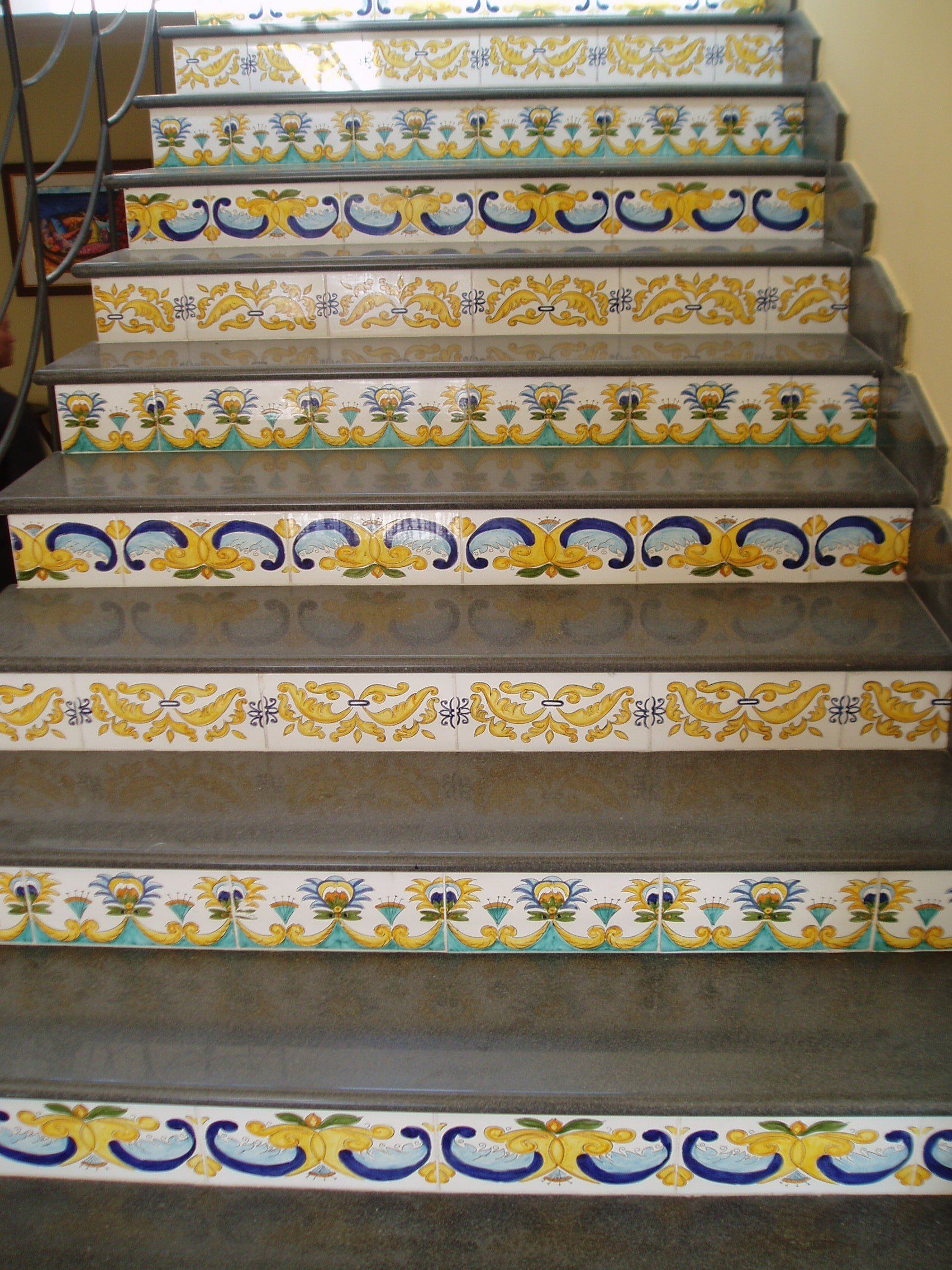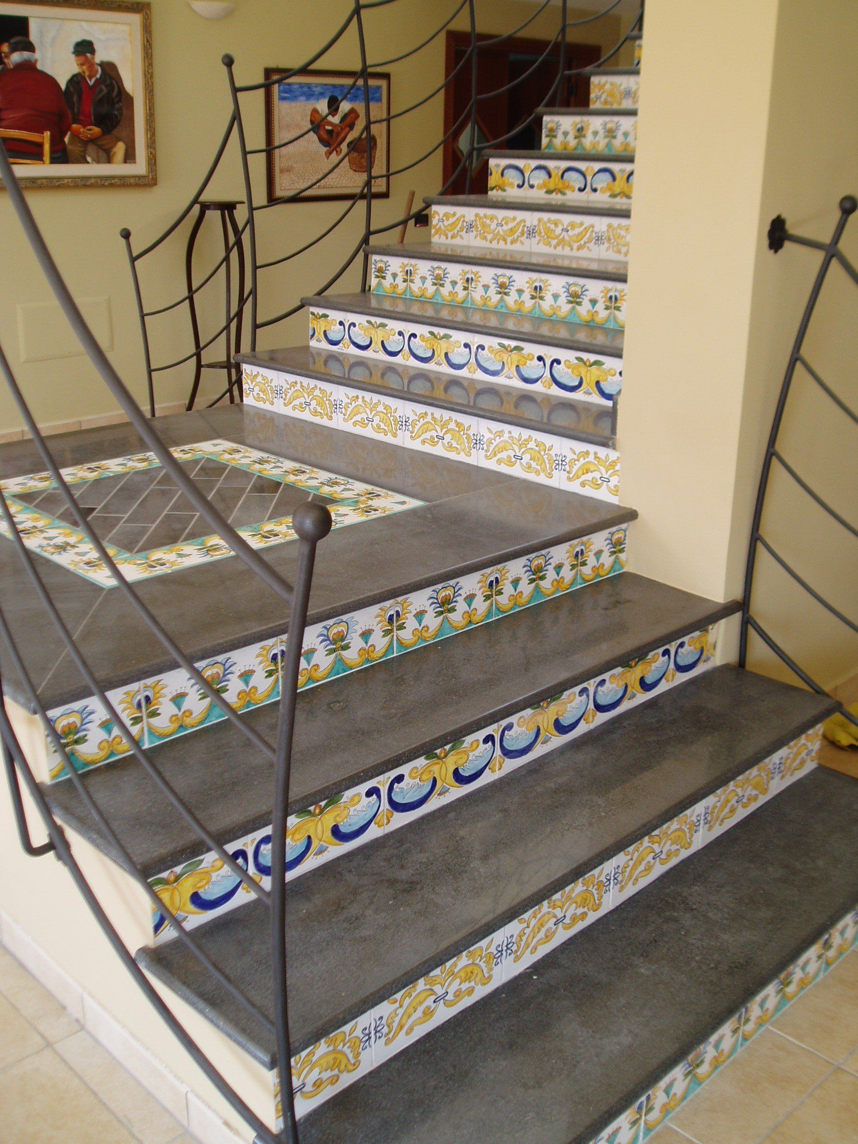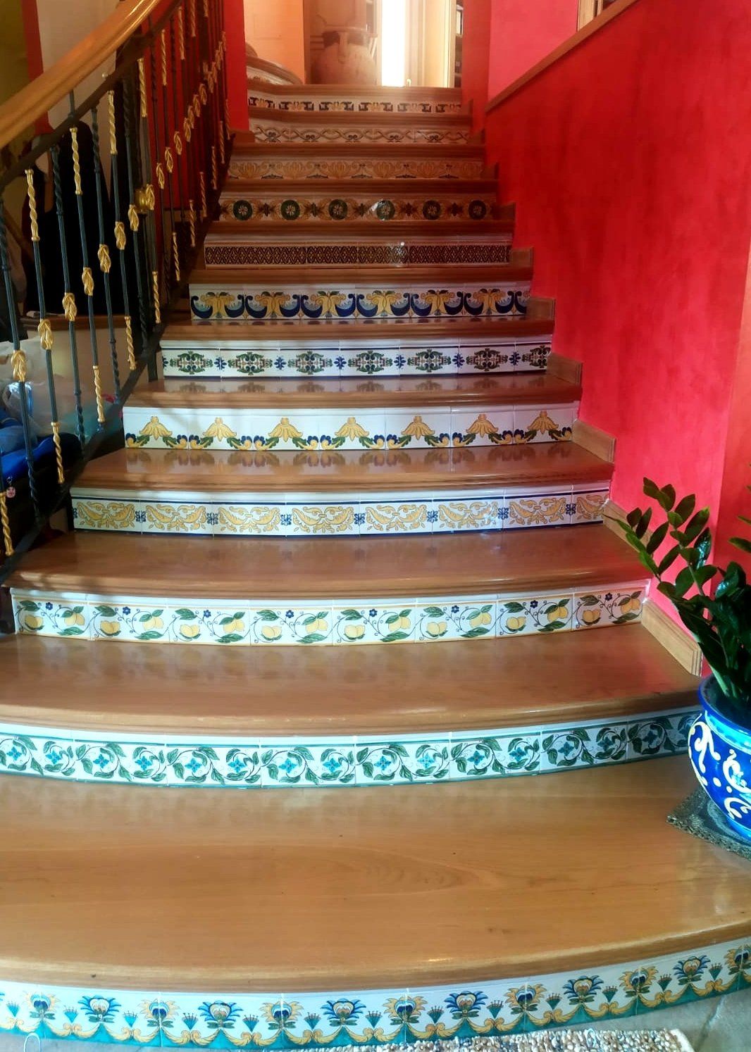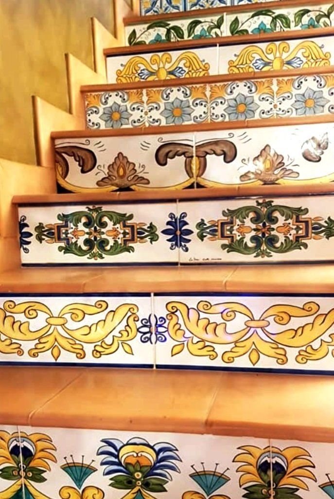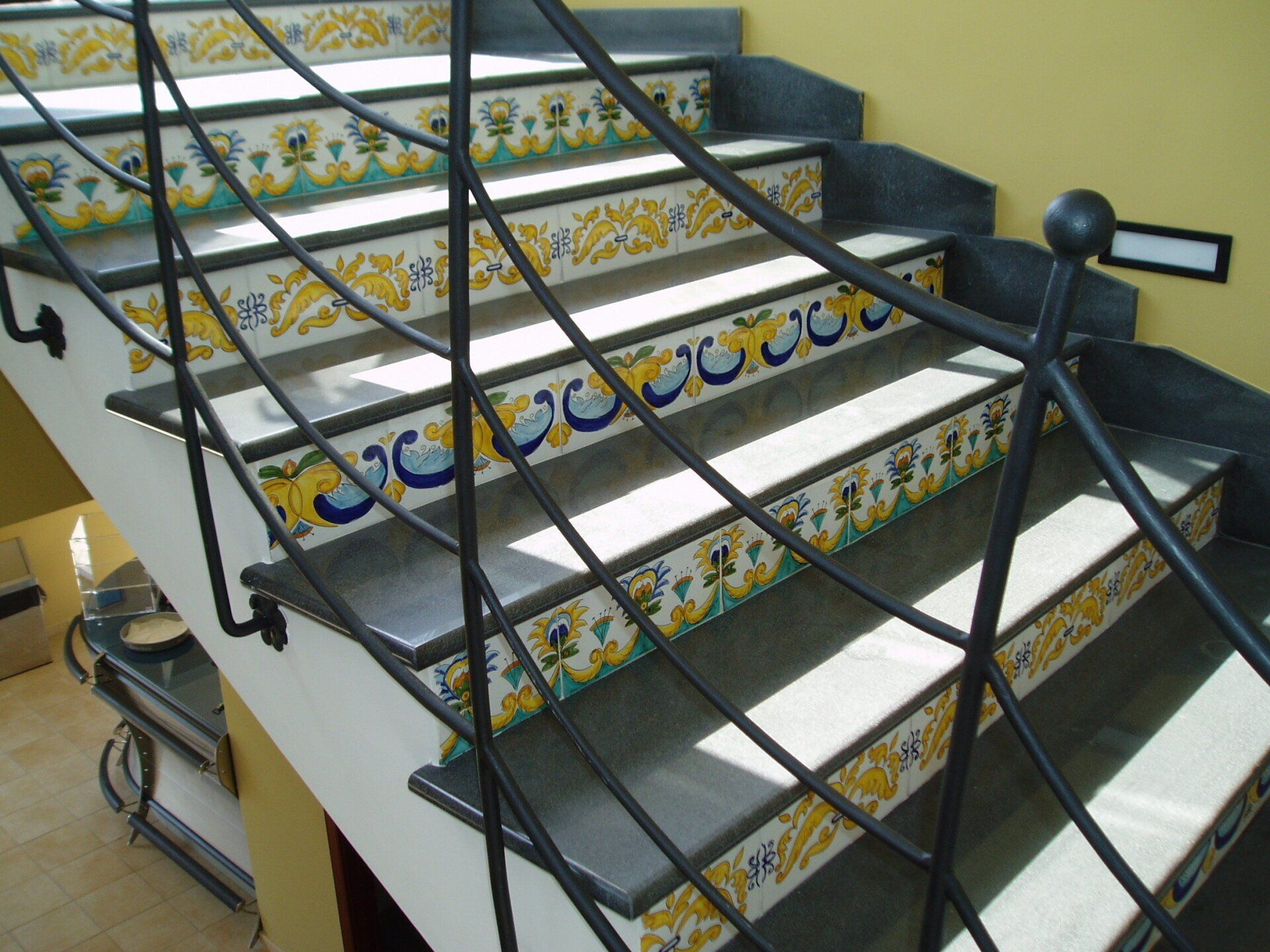 Protagonista dell'intero ambiente la scala con alzate in maiolica che trasformano le rampe in suggestive opere d'arte.