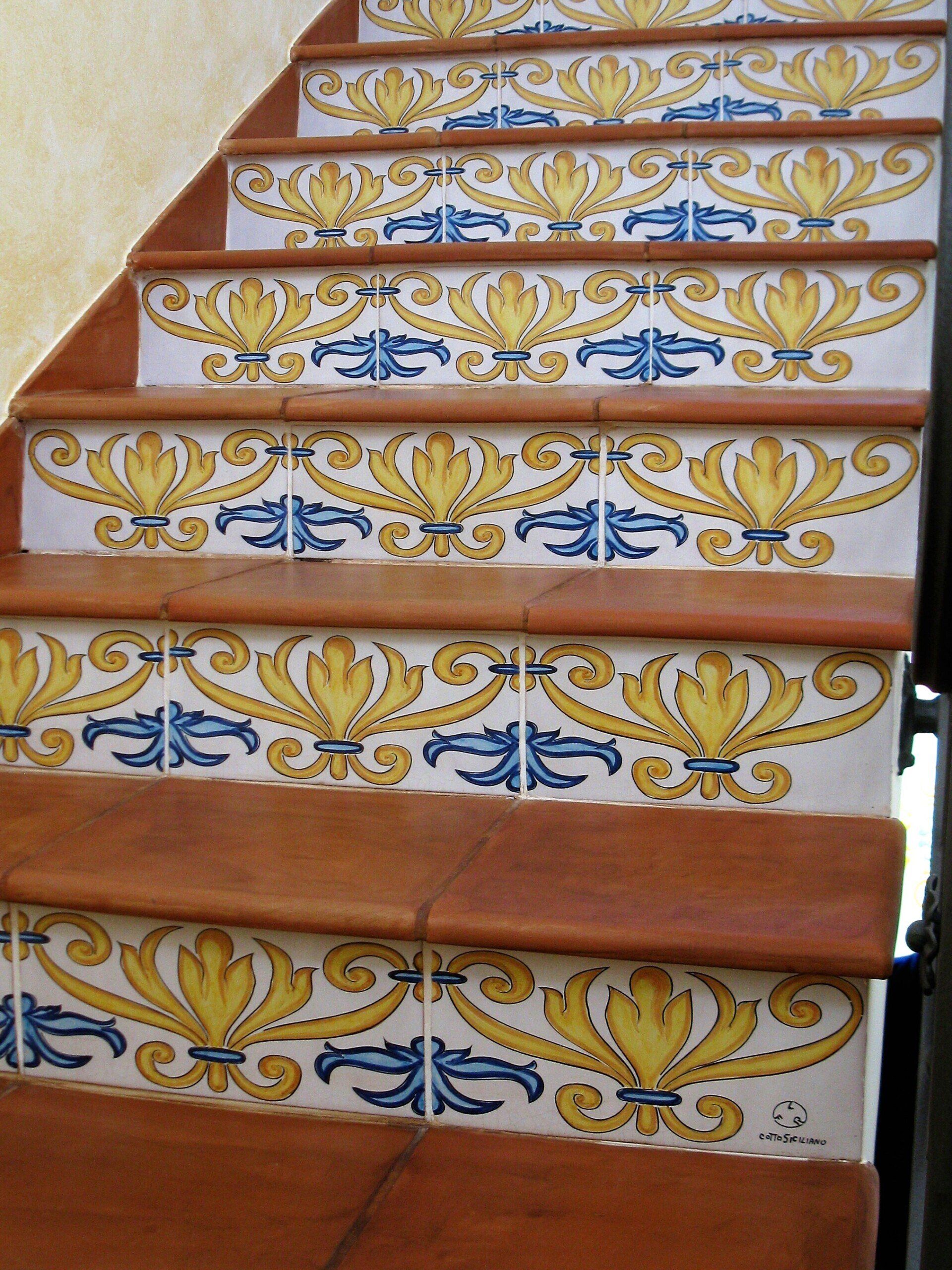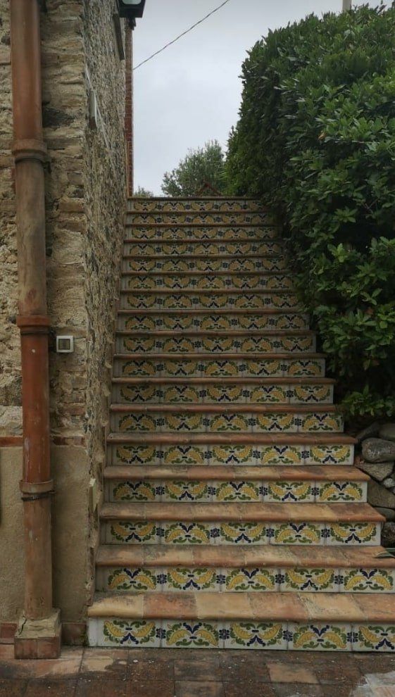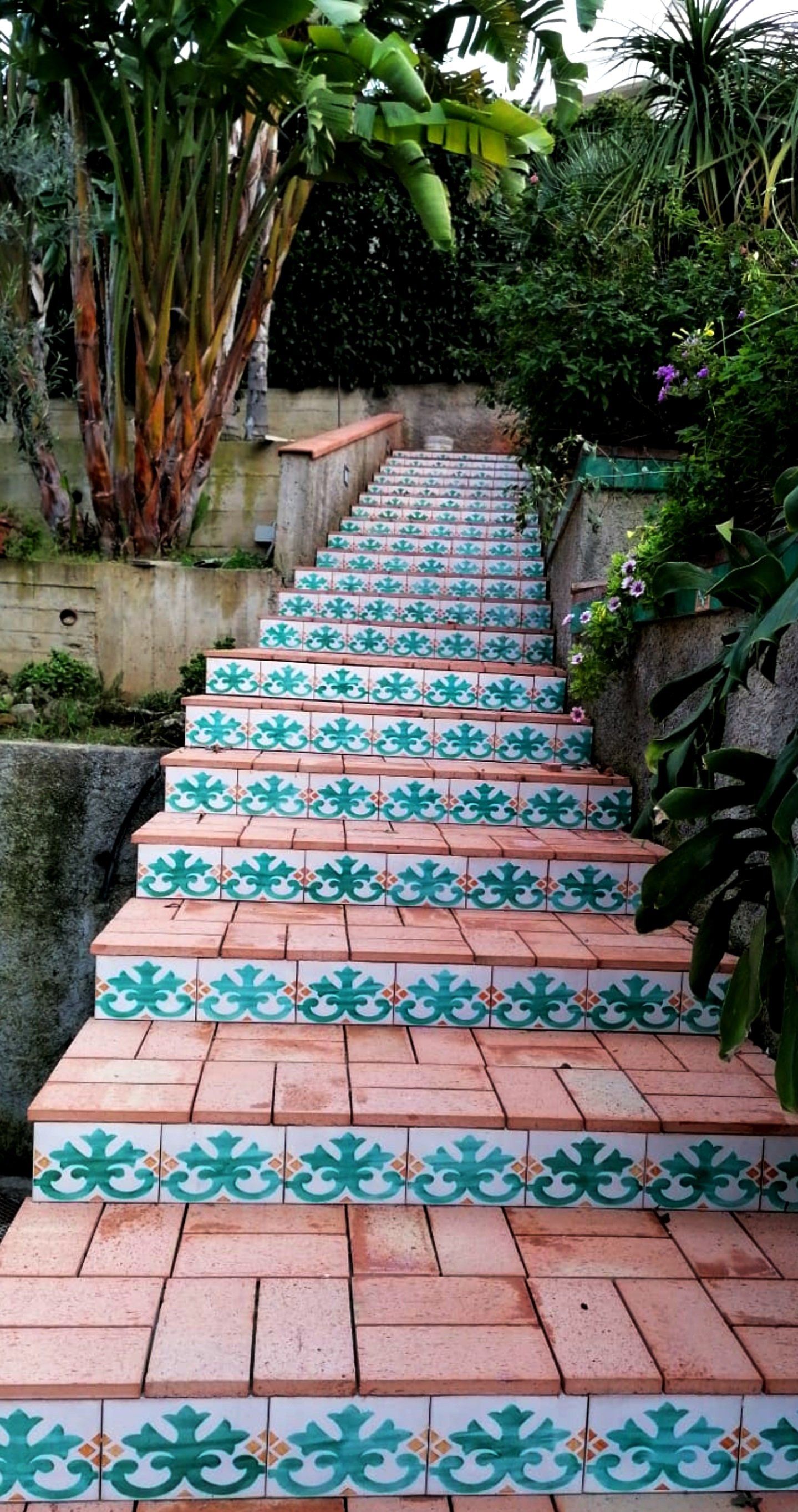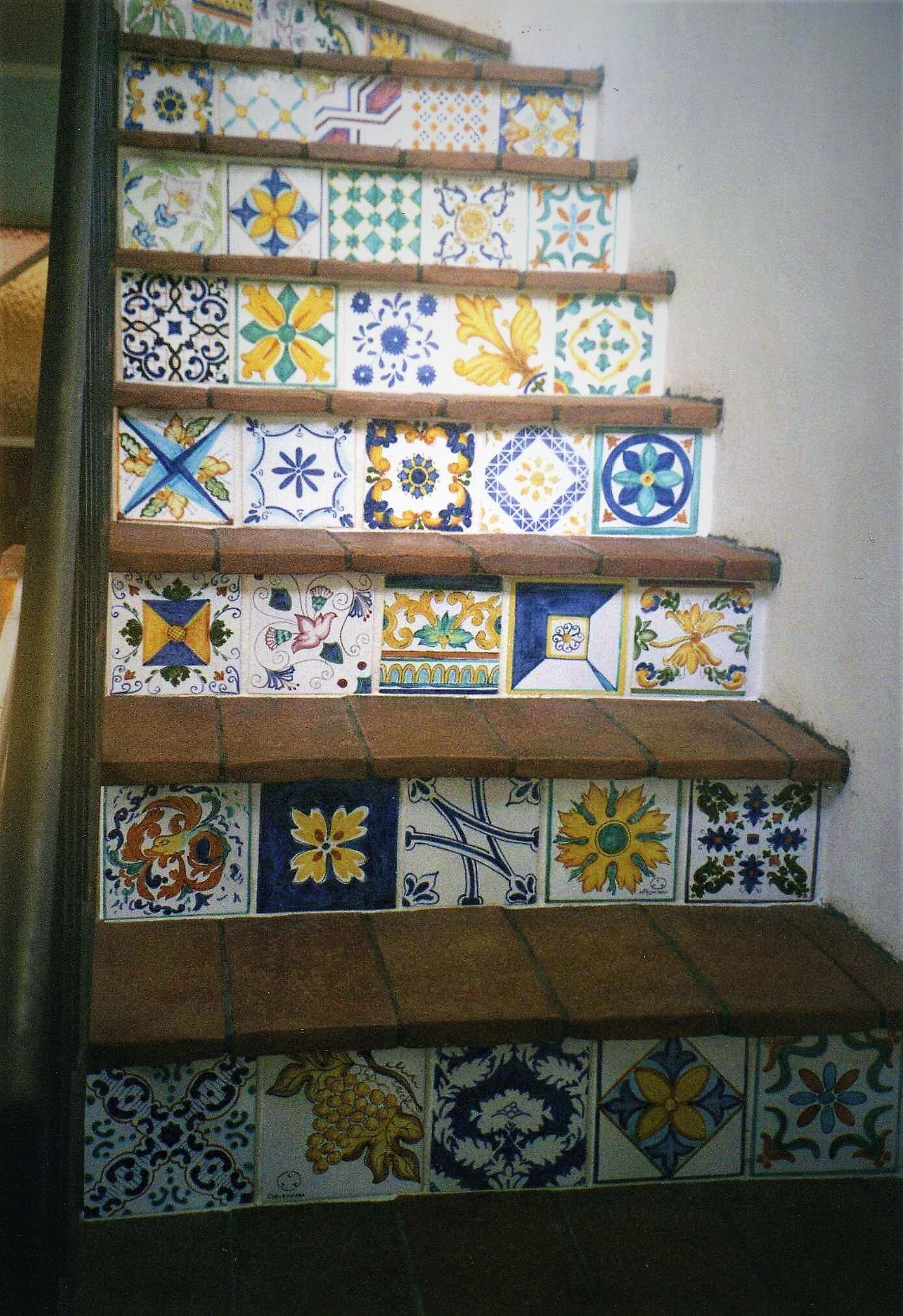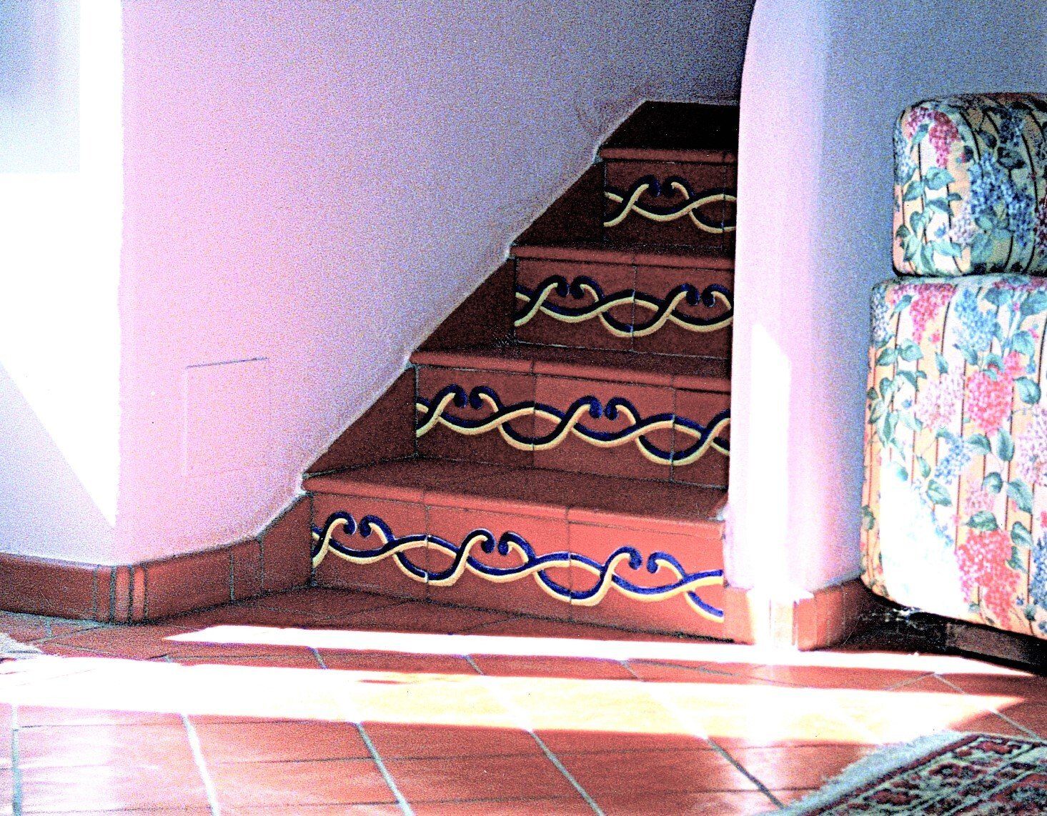 Protagonista dell'intero ambiente la scala con alzate in maiolica che trasformano le rampe in suggestive opere d'arte.