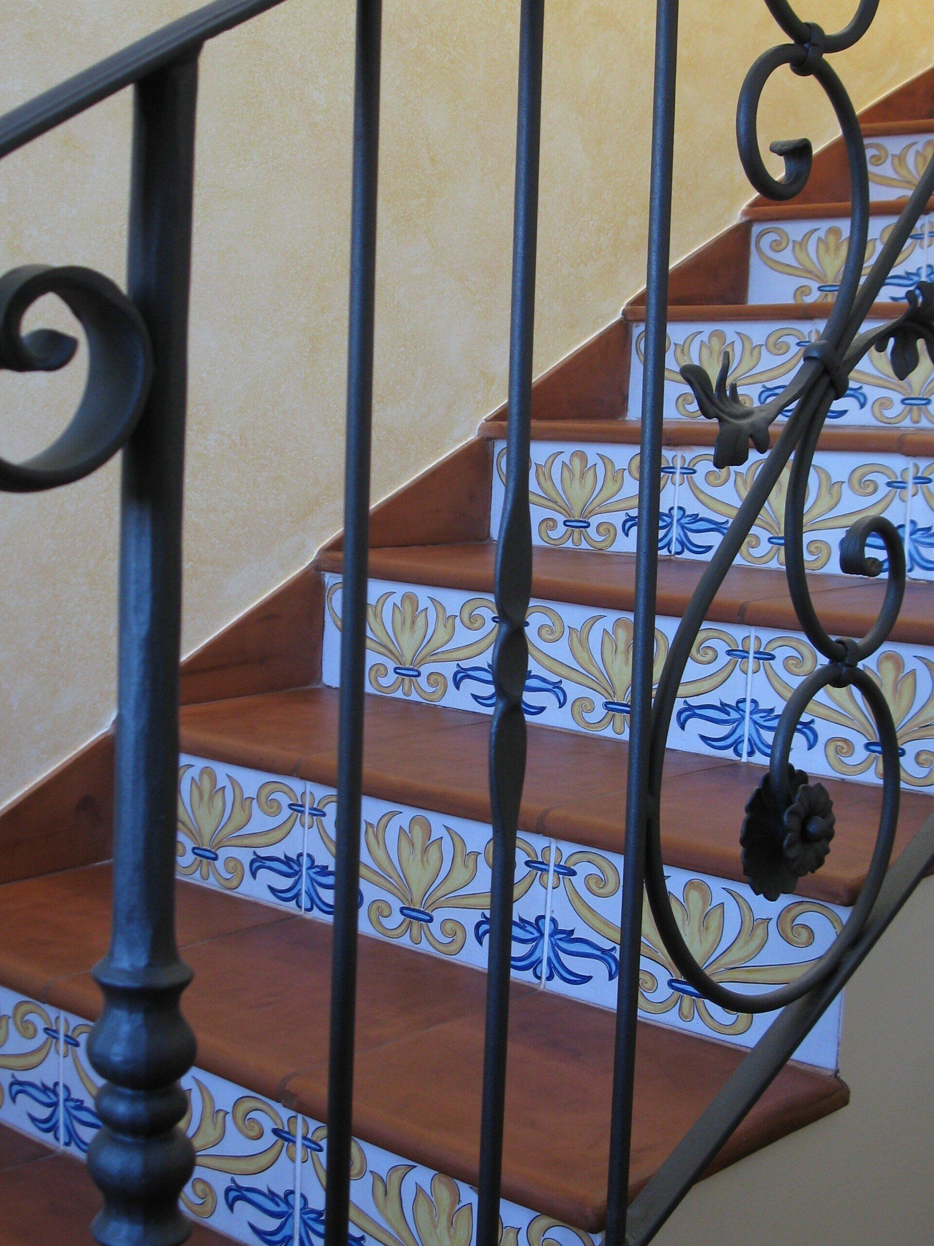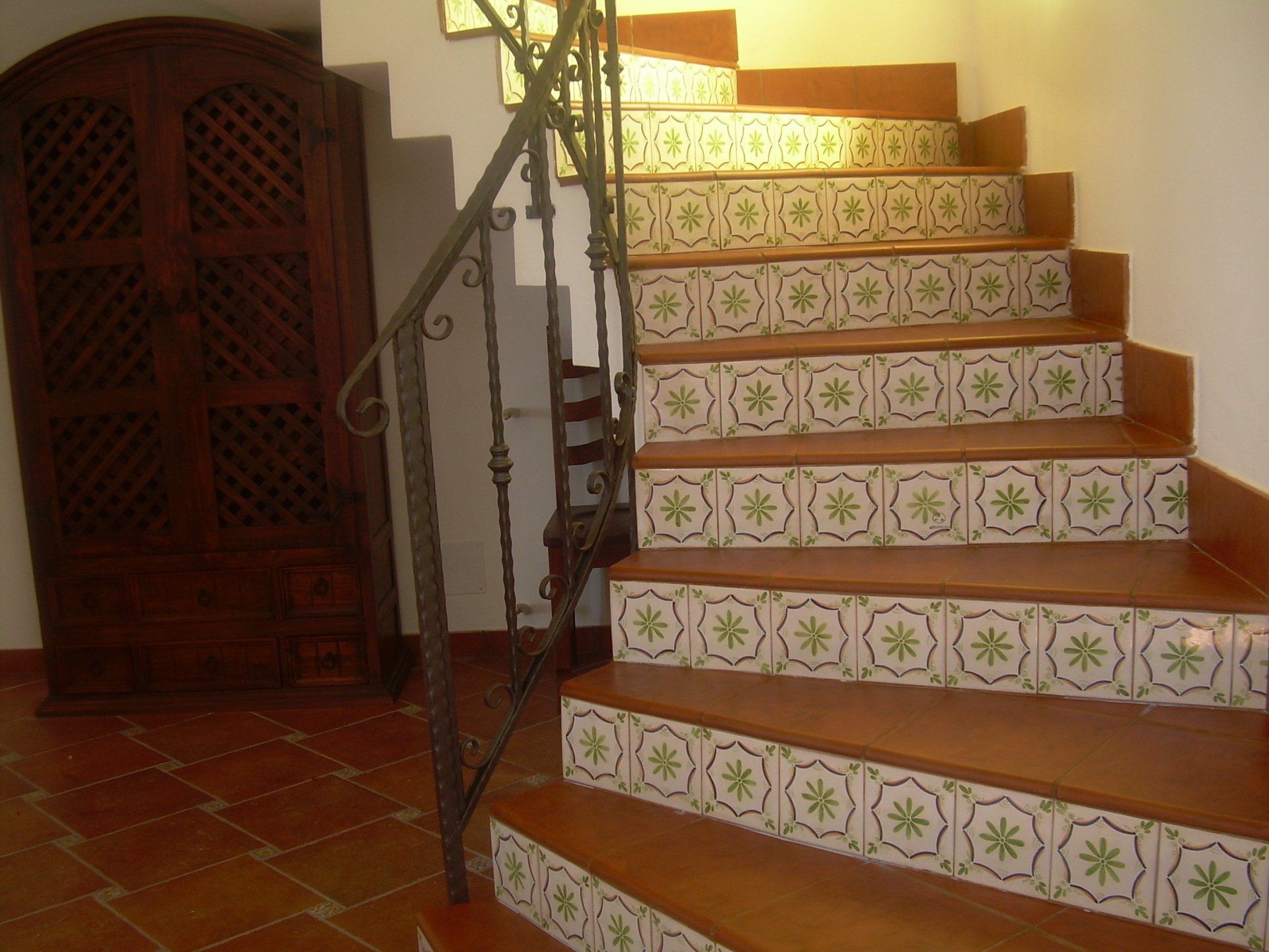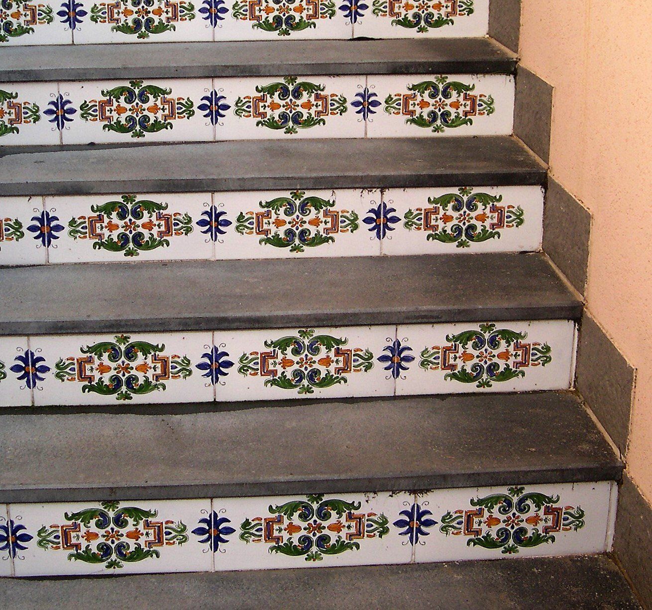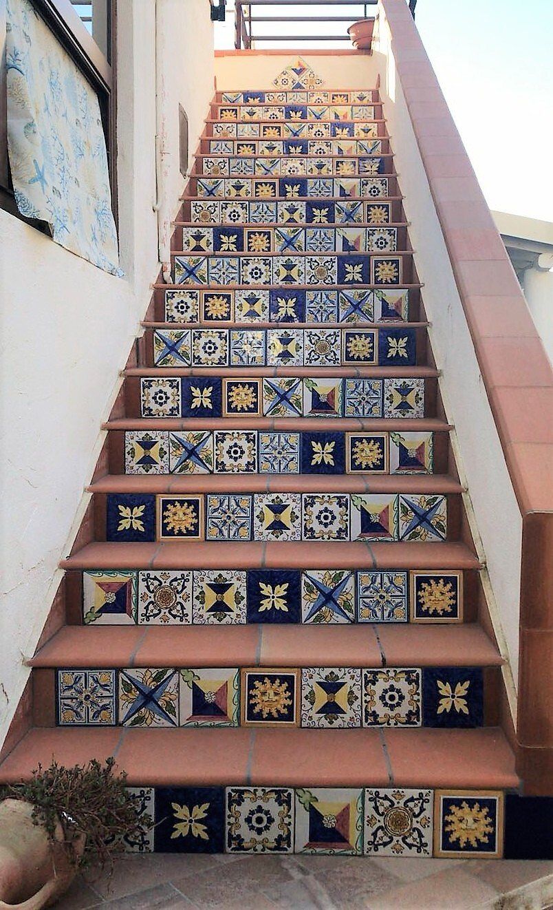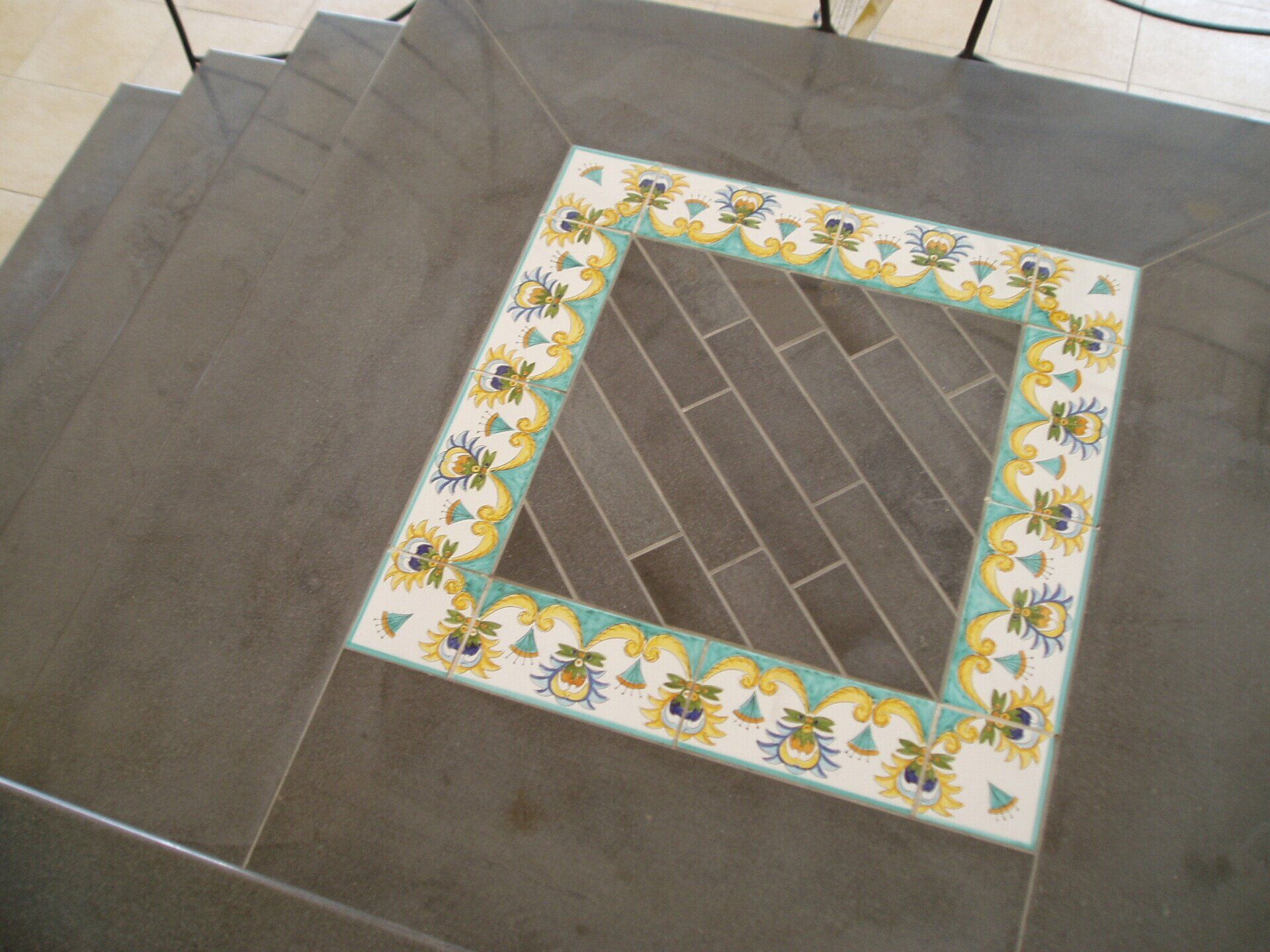 Protagonista dell'intero ambiente la scala con alzate in maiolica che trasformano le rampe in suggestive opere d'arte.